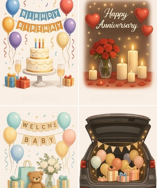 Choose from 1000+ creative decoration designs crafted for birthdays, anniversaries, Welcome Baby, Car Boot Decoration and special surprises, offering unique themes, elegant styles and unforgettable setups for every celebration.